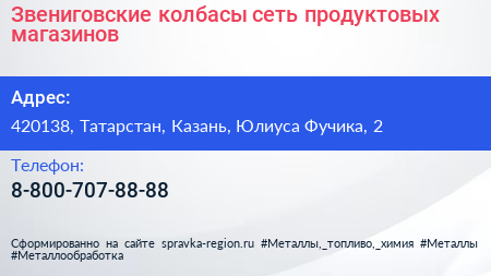 Звениговские колбасы, сеть продуктовых магазинов по адресу 420138, Татарстан, Казань, Юлиуса Фучика, 2 в дальнейшем Организация, размещена в следующих категориях: