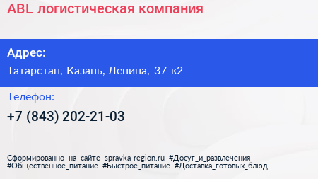 ABL, логистическая компания по адресу Татарстан, Казань, Ленина, 37 к2 в дальнейшем Организация, размещена в следующих категориях: