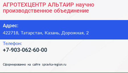 АГРОТЕХЦЕНТР-АЛЬТАИР, научно-производственное объединение по адресу 422718, Татарстан, Казань, Дорожная, 2 в дальнейшем Организация, размещена в следующих категориях: