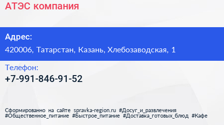 АТЭС, компания по адресу 420006, Татарстан, Казань, Хлебозаводская, 1 в дальнейшем Организация, размещена в следующих категориях: