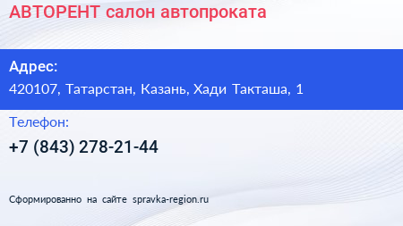 АВТОРЕНТ, салон автопроката по адресу 420107, Татарстан, Казань, Хади Такташа, 1 в дальнейшем Организация, размещена в следующих категориях: