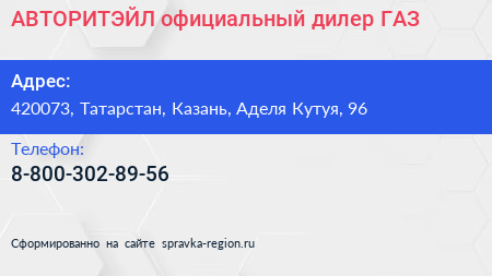 АВТОРИТЭЙЛ, официальный дилер ГАЗ по адресу 420073, Татарстан, Казань, Аделя Кутуя, 96 в дальнейшем Организация, размещена в следующих категориях:
