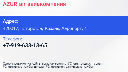 AZUR air, авиакомпания по адресу 420017, Татарстан, Казань, Аэропорт, 1 в дальнейшем Организация, размещена в следующих категориях: