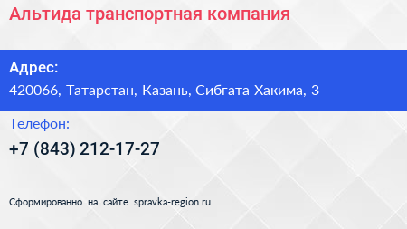 Альтида, транспортная компания по адресу 420066, Татарстан, Казань, Сибгата Хакима, 3 в дальнейшем Организация, размещена в следующих категориях: