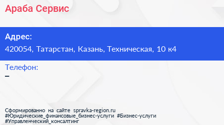 Араба-Сервис по адресу 420054, Татарстан, Казань, Техническая, 10 к4 в дальнейшем Организация, размещена в следующих категориях: