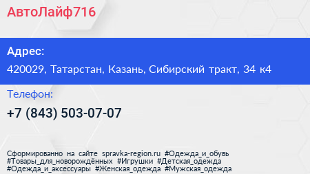 АвтоЛайф716 по адресу 420029, Татарстан, Казань, Сибирский тракт, 34 к4 в дальнейшем Организация, размещена в следующих категориях: