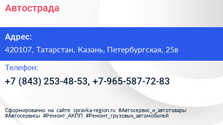Автострада по адресу 420107, Татарстан, Казань, Петербургская, 25в в дальнейшем Организация, размещена в следующих категориях: