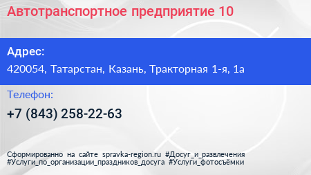 Автотранспортное предприятие-10 по адресу 420054, Татарстан, Казань, Тракторная 1-я, 1а в дальнейшем Организация, размещена в следующих категориях: