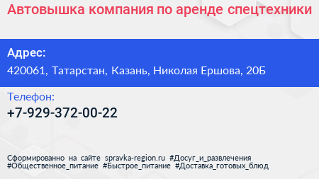 Автовышка, компания по аренде спецтехники по адресу 420061, Татарстан, Казань, Николая Ершова, 20Б в дальнейшем Организация, размещена в следующих категориях: