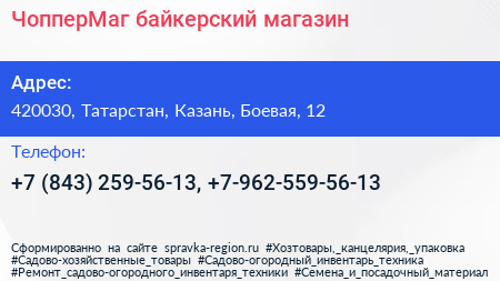 ЧопперМаг, байкерский магазин по адресу 420030, Татарстан, Казань, Боевая, 12 в дальнейшем Организация, размещена в следующих категориях: