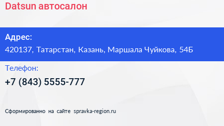 Datsun, автосалон по адресу 420137, Татарстан, Казань, Маршала Чуйкова, 54Б в дальнейшем Организация, размещена в следующих категориях:
