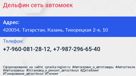 Дельфин, сеть автомоек по адресу 420054, Татарстан, Казань, Тихорецкая 2-я, 10 в дальнейшем Организация, размещена в следующих категориях: