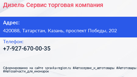 Дизель-Сервис, торговая компания по адресу 420088, Татарстан, Казань, проспект Победы, 202 в дальнейшем Организация, размещена в следующих категориях: