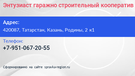 Энтузиаст, гаражно-строительный кооператив по адресу 420087, Татарстан, Казань, Родины, 2 к1 в дальнейшем Организация, размещена в следующих категориях: