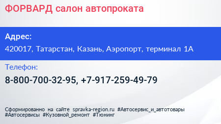 ФОРВАРД, салон автопроката по адресу 420017, Татарстан, Казань, Аэропорт, терминал 1А в дальнейшем Организация, размещена в следующих категориях: