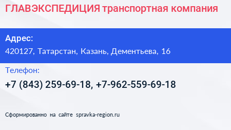 ГЛАВЭКСПЕДИЦИЯ, транспортная компания по адресу 420127, Татарстан, Казань, Дементьева, 16 в дальнейшем Организация, размещена в следующих категориях: