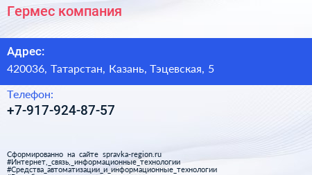 Гермес, компания по адресу 420036, Татарстан, Казань, Тэцевская, 5 в дальнейшем Организация, размещена в следующих категориях: