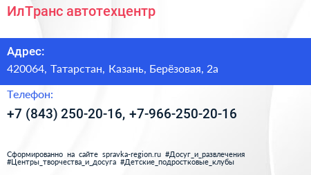 ИлТранс, автотехцентр по адресу 420064, Татарстан, Казань, Берёзовая, 2а в дальнейшем Организация, размещена в следующих категориях: