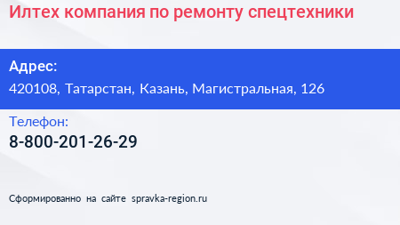 Илтех, компания по ремонту спецтехники по адресу 420108, Татарстан, Казань, Магистральная, 126 в дальнейшем Организация, размещена в следующих категориях: