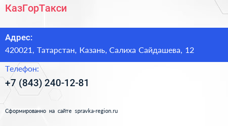 КазГорТакси по адресу 420021, Татарстан, Казань, Салиха Сайдашева, 12 в дальнейшем Организация, размещена в следующих категориях: