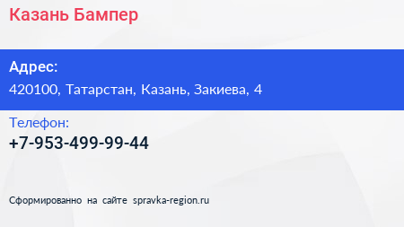 Казань Бампер по адресу 420100, Татарстан, Казань, Закиева, 4 в дальнейшем Организация, размещена в следующих категориях:
