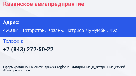 Казанское авиапредприятие по адресу 420081, Татарстан, Казань, Патриса Лумумбы, 49а в дальнейшем Организация, размещена в следующих категориях: