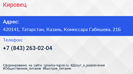 Кировец по адресу 420141, Татарстан, Казань, Комиссара Габишева, 21Б в дальнейшем Организация, размещена в следующих категориях: