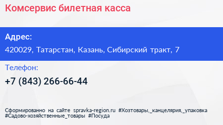 Комсервис, билетная касса по адресу 420029, Татарстан, Казань, Сибирский тракт, 7 в дальнейшем Организация, размещена в следующих категориях: