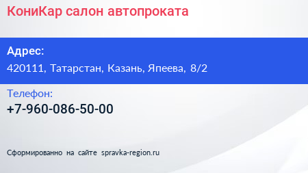 КониКар, салон автопроката по адресу 420111, Татарстан, Казань, Япеева, 8/2 в дальнейшем Организация, размещена в следующих категориях: