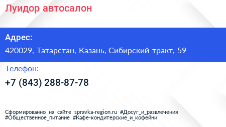 Луидор, автосалон по адресу 420029, Татарстан, Казань, Сибирский тракт, 59 в дальнейшем Организация, размещена в следующих категориях:
