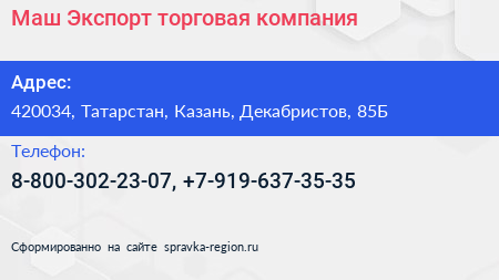 Маш Экспорт, торговая компания по адресу 420034, Татарстан, Казань, Декабристов, 85Б в дальнейшем Организация, размещена в следующих категориях: