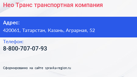 Нео Транс, транспортная компания по адресу 420061, Татарстан, Казань, Аграрная, 52 в дальнейшем Организация, размещена в следующих категориях: