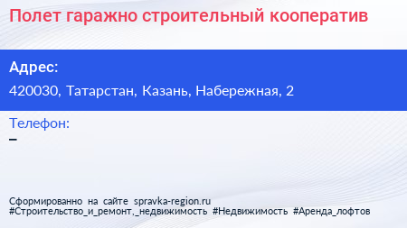 Полет, гаражно-строительный кооператив по адресу 420030, Татарстан, Казань, Набережная, 2 в дальнейшем Организация, размещена в следующих категориях:
