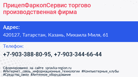 ПрицепФаркопСервис, торгово-производственная фирма по адресу 420127, Татарстан, Казань, Михаила Миля, 61 в дальнейшем Организация, размещена в следующих категориях: