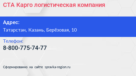 СТА Карго, логистическая компания по адресу Татарстан, Казань, Берёзовая, 10 в дальнейшем Организация, размещена в следующих категориях:
