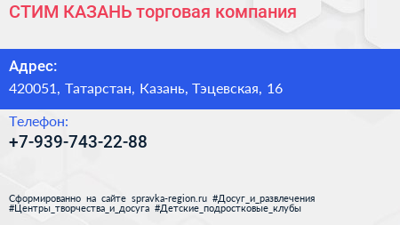 СТИМ-КАЗАНЬ, торговая компания по адресу 420051, Татарстан, Казань, Тэцевская, 16 в дальнейшем Организация, размещена в следующих категориях: