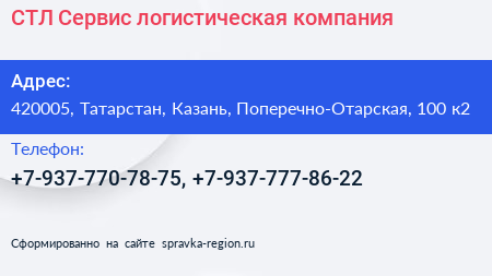 СТЛ-Сервис, логистическая компания по адресу 420005, Татарстан, Казань, Поперечно-Отарская, 100 к2 в дальнейшем Организация, размещена в следующих категориях: