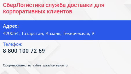 СберЛогистика, служба доставки для корпоративных клиентов по адресу 420054, Татарстан, Казань, Техническая, 9 в дальнейшем Организация, размещена в следующих категориях: