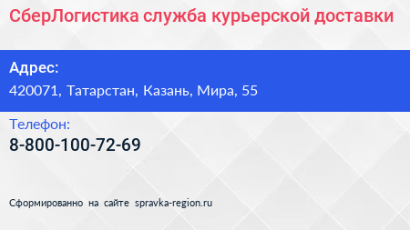 СберЛогистика, служба курьерской доставки по адресу 420071, Татарстан, Казань, Мира, 55 в дальнейшем Организация, размещена в следующих категориях: