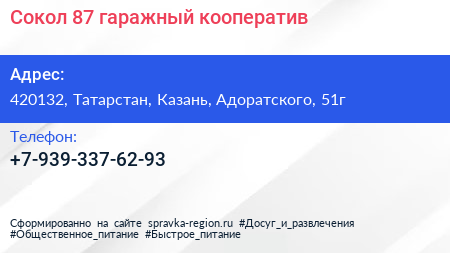 Сокол-87, гаражный кооператив по адресу 420132, Татарстан, Казань, Адоратского, 51г в дальнейшем Организация, размещена в следующих категориях: