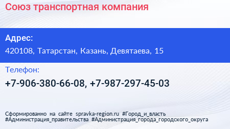 Союз, транспортная компания по адресу 420108, Татарстан, Казань, Девятаева, 15 в дальнейшем Организация, размещена в следующих категориях: