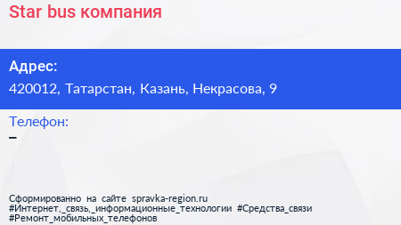 Star-bus, компания по адресу 420012, Татарстан, Казань, Некрасова, 9 в дальнейшем Организация, размещена в следующих категориях: