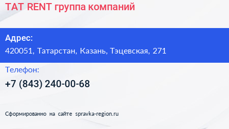 TAT.RENT, группа компаний по адресу 420051, Татарстан, Казань, Тэцевская, 271 в дальнейшем Организация, размещена в следующих категориях: