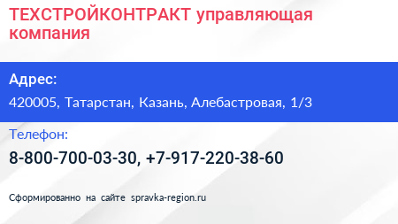 ТЕХСТРОЙКОНТРАКТ, управляющая компания по адресу 420005, Татарстан, Казань, Алебастровая, 1/3 в дальнейшем Организация, размещена в следующих категориях:
