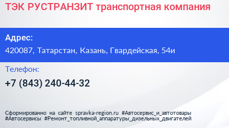 ТЭК РУСТРАНЗИТ, транспортная компания по адресу 420087, Татарстан, Казань, Гвардейская, 54и в дальнейшем Организация, размещена в следующих категориях: