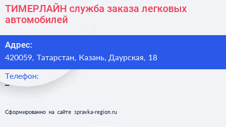 ТИМЕРЛАЙН, служба заказа легковых автомобилей по адресу 420059, Татарстан, Казань, Даурская, 18 в дальнейшем Организация, размещена в следующих категориях: