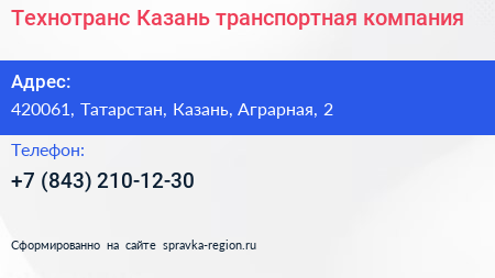 Технотранс Казань, транспортная компания по адресу 420061, Татарстан, Казань, Аграрная, 2 в дальнейшем Организация, размещена в следующих категориях: