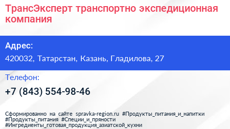 ТрансЭксперт, транспортно-экспедиционная компания по адресу 420032, Татарстан, Казань, Гладилова, 27 в дальнейшем Организация, размещена в следующих категориях: