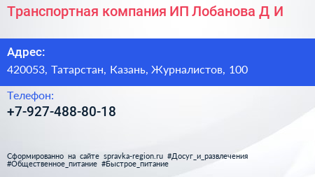 Транспортная компания, ИП Лобанова Д.И. по адресу 420053, Татарстан, Казань, Журналистов, 100 в дальнейшем Организация, размещена в следующих категориях: