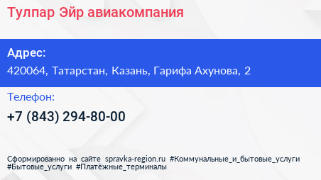 Тулпар Эйр, авиакомпания по адресу 420064, Татарстан, Казань, Гарифа Ахунова, 2 в дальнейшем Организация, размещена в следующих категориях: